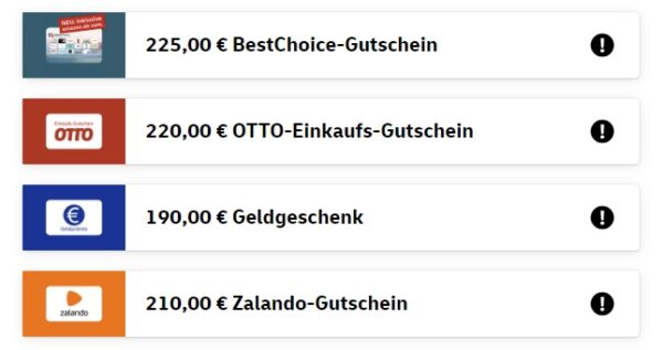 - Bis zu 225€ Prämie in Form verschiedener Gutscheine oder Bargeld