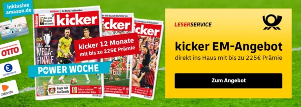 Beim LeserService der Deutschen Post erhaltet ihr als EM-Angebot bis einschließlich 10. Juni, 12 Uhr das kicker Jahresabo für 330,40€ + bis zu 225€ Prämie. 🙂