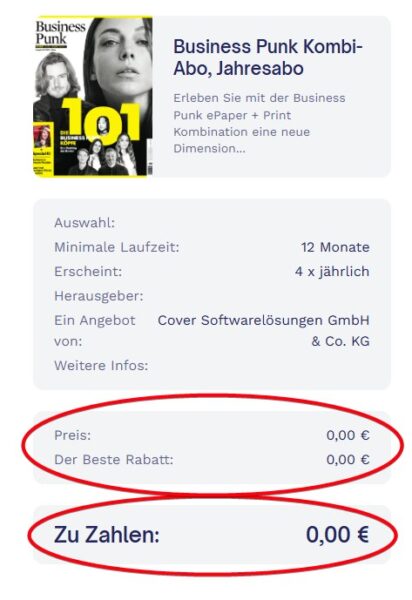Nice, endlich kann man mal wieder ein Abo kostenlos abstauben, diesmal gibt es bei DasBesteAbo 1 Jahr Business Punk Kombi-Abo gratis