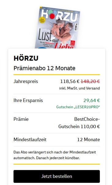 - Jahresabo Hörzu für 118,56€ – 110€ BestChoice Gutschein.