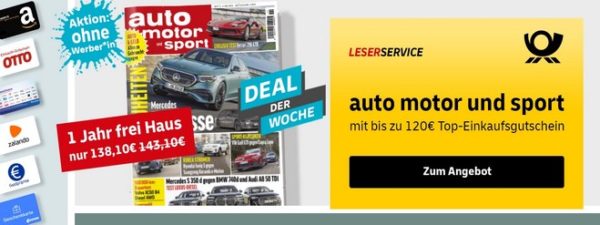 Beim LeserService der Deutschen Post erhaltet ihr als Deal der Woche bis einschließlich 17. Mai auto motor und sport mit erhöhter Prämie. 🙂