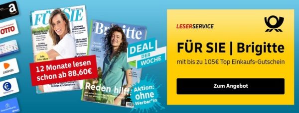 Beim Leserservice der Deutschen Post erhaltet ihr jetzt als Deal der Woche das Jahresabo FÜR SIE für 88,60€ + bis zu 90€ Prämie oder Brigitte für 100,30€ + bis zu 105€ Prämie. 🙂