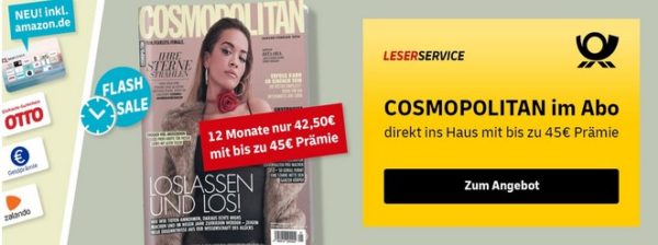 Beim LeserService der Deutschen Post erhaltet ihr im Flash-Sale bis einschließlich 15. Januar, 12 Uhr das COSMOPOLITAN Jahresabo für 42,50€ + bis zu 45€ Prämie!