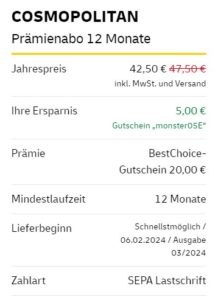 Leserservice Flash-Sale: COSMOPOLITAN Jahresabo für 42,50€ + bis zu 45€ Prämie
