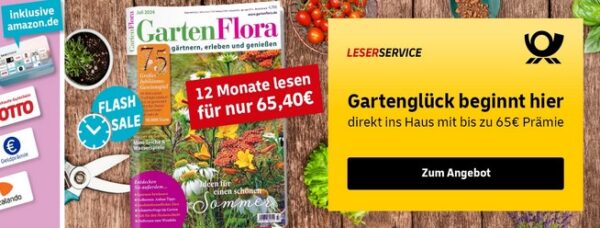Beim Leserservice der Deutschen Post erhaltet ihr jetzt im Flash-Sale die beliebte Zeitschrift GartenFlora für 65,40€ mit bis zu 65€ Prämie.