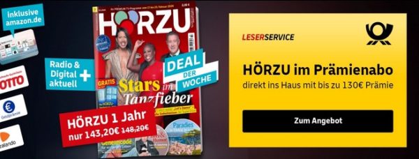 Beim Leserservice der Deutschen Post erhaltet ihr jetzt HÖRZU TV-Magazine im 12 Monate Prämienabo zu reduzierten Angebotspreisen. 🙂