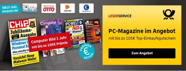 Beim Leserservice der Deutschen Post erhaltet ihr jetzt einige Zeitschriften im Jahresabo mit erhöhten Prämien. 🙂