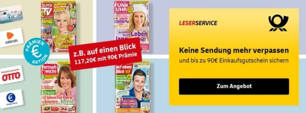 Beim Leserservice der Deutschen Post erhaltet ihr jetzt 4 TV-Magazine im 12 Monate Prämienabo zu reduzierten Angebotspreisen. 🙂