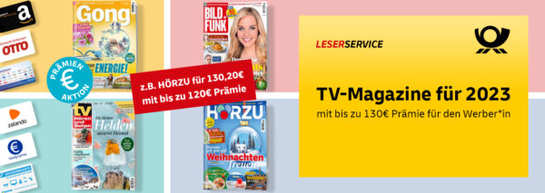 Beim Leserservice der Deutschen Post erhaltet ihr jetzt einige TV-Magazine im Jahresabo mit erhöhten Prämien. 🙂