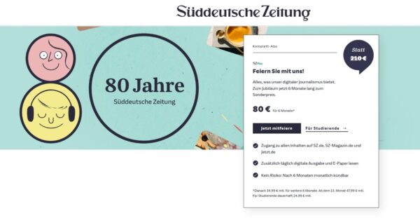 Die Süddeutsche Zeitung feiert 80. Geburtstag, anlässlich dazu könnt ihr euch für kurze Zeit das SZ Plus Halbjahresabo für nur 80€ (statt 210€) sichern.
