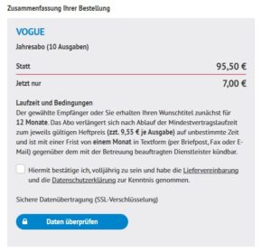 Der gewählte Empfänger oder Sie erhalten Ihren Wunschtitel zunächst für 12 Monate. Das Abo verlängert sich nach Ablauf der Mindestvertragslaufzeit zum jeweils gültigen Heftpreis (zzt. 9,55 € je Ausgabe) auf unbestimmte Zeit und ist mit einer Frist von einem Monat in Textform (per Briefpost, Fax oder E-Mail) gegenüber dem mit der Betreuung beauftragten Dienstleister kündbar.