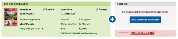 Bei Hobby + Freizeit gibt es das BERGWELTEN Jahresabo für 37€ + bis zu 30€ Prämie.