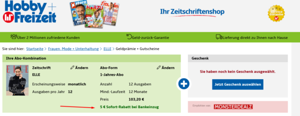 Bei Hobby + Freizeit gibt es das ELLE Jahresabo für 98,20€ + bis zu 95€ Prämie.