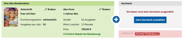 Bei Hobby + Freizeit gibt es das Frau mit Herz Jahresabo für 153,60€ + bis zu 145€ Prämie.