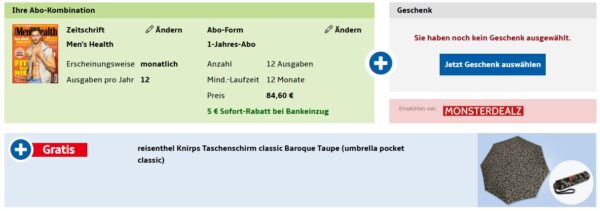 Bei Hobby + Freizeit gibt es das Men’s Health Jahresabo für 79,60€ + bis zu 80€ Prämie.