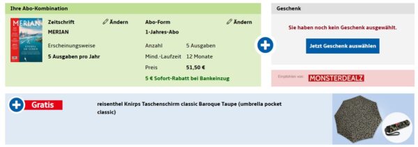 Bei Hobby + Freizeit gibt es das MERIAN Jahresabo für 46,50€ + bis zu 45€ Prämie.