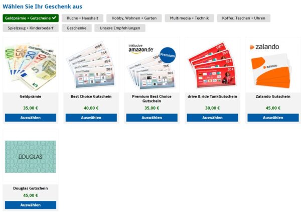 Diese Prämien stehen zum Beispiel zur Auswahl:
