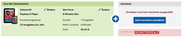 Bei Hobby + Freizeit gibt es das Playboy Digital 6-Monats-Abo für 40,25€ + bis zu 35€ Prämie.