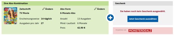 Bei Hobby + Freizeit gibt es das TV Movie 6-Monats-Abo für 42,90€ + bis zu 35€ Prämie.