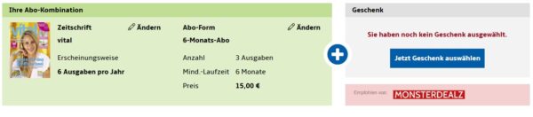 Bei Hobby + Freizeit gibt es das vital 6-Monats-Abo für 15€ + bis zu 15€ Prämie.
