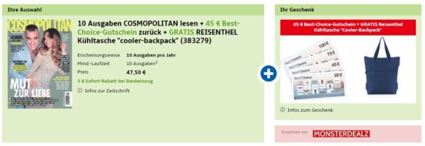 Bei Hobby + Freizeit erhaltet ihr in einer Sonderaktion 10 Ausgaben COSMOPOLITAN für 42,50€ + 45€ Prämie + GRATIS reisenthel Kühltasche (Wert ~30€). 🙂