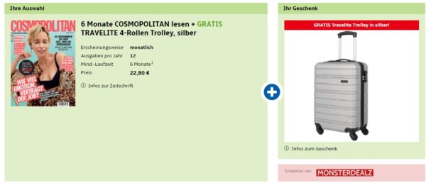 Bei Hobby & Freizeit gibt es 6 Monate Cosmopolitan für 22,80€ + GRATIS Travelite Trolley!