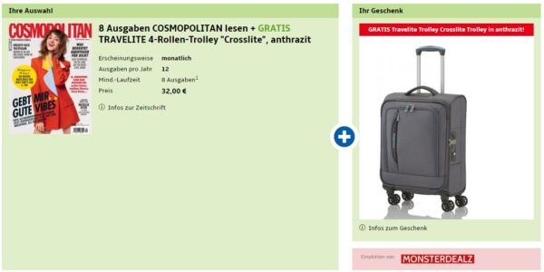 Bei Hobby & Freizeit gibt es 8 Monate Cosmopolitan für 32€ + GRATIS Travelite Crosslite 4-Rollen Trolley S!