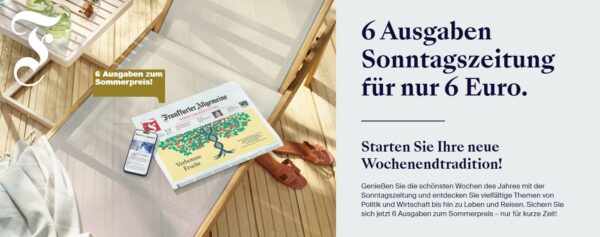 Die Frankfurter Allgemeine Sonntagszeitung hat eine neue Aktion gestartet, bei der ihr die F.A.S für 6 Wochen für 6€ (statt ~38€) Ersparnis ~32€ lesen könnt.