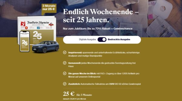 Die F.A.S. (Frankfurter Allgemeine Sonntagszeitung) dürfte eigentlich den meisten, deutschlandweit ein Begriff sein. Aktuell erhaltet ihr bei der F.A.Z. 3 Monate die F.A.S inkl. FAZ+ für 25€ alternativ auch als Print-Version für 25€