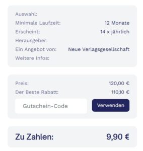 Um ein Abonnement bei der Neue Verlagsgesellschaft zu kündigen, können Sie schriftlich per Brief oder E-Mail kündigen oder die Kündigung telefonisch durchführen. Die Kündigung sollte unter Angabe Ihrer Kundennummer und der Vertragsdaten an die Neue Verlagsgesellschaft mbH, Postfach 2130, 77611 Offenburg gesendet werden.. Die E-Mail-Adresse lautet [email protected]