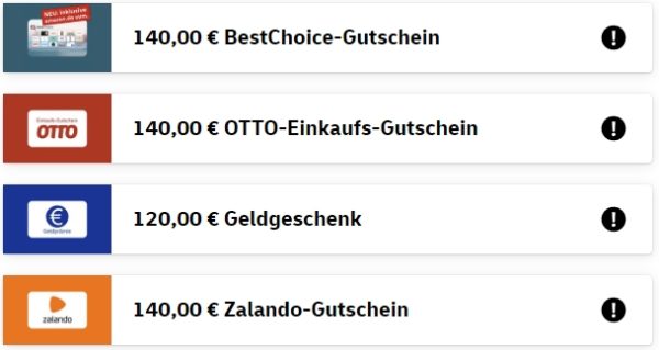- Bis zu 140€ Prämie in Form verschiedener Gutscheine oder Bargeld