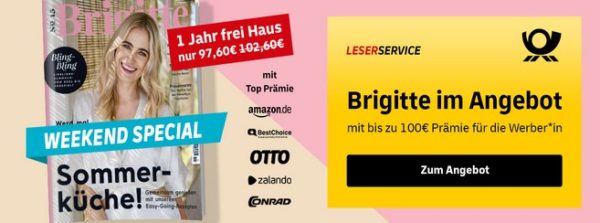 Zeitschrift gesucht? Beim Leserservice bekommt ihr gerade als Weekend-Special 27 Ausgaben der Brigitte für 97,60€ und bis zu 100€ Prämie
