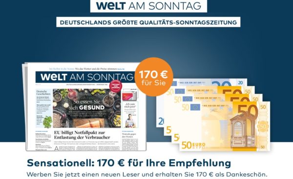 WELT AM SONNTAG für 275,88€ abonnieren und 170€ Geld-Prämie erhalten
