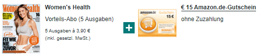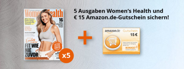 Denn bei Motor Presse bekommt man die Womans Health-Zeitschrift (5 Ausgaben) für 19,50€ inkl. 15€ Amazon.de*-Gutschein.