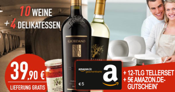 Ihr bekommt 10 Weine + 4 Delikatessen + 12-tlg. Tellerset + 5€ Amazon.de Gutschein* für 39,90€