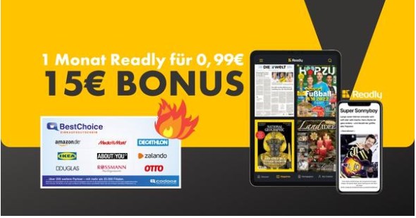 15€ BestChoice-Premium Gutschein geschenkt (für 1 Monat Readly 0,99€/mtl.)