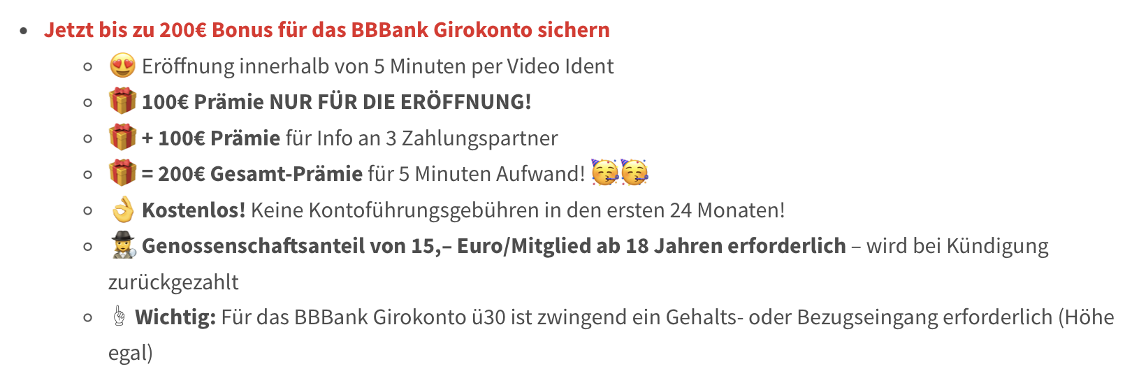 Voraussetzungen Startprämie: 50,– Euro für die Eröffnung eines BBBank-Girokontos. Bis zur Vollendung des 30. Lebensjahres kostenfrei. Ab Vollendung des 30. Lebensjahres: 24 Monate kostenfreie Kontoführung bei Online-Überweisungen danach mtl. Kontoführungsentgelt i. H. v. 2,95 Euro bei Online-Überweisung, 24 Monate kostenfreie girocard (Ausgabe einer Debitkarte) danach 11,95 Euro p. a.; Neukunde (kein Girokonto in den letzten 24 Monaten). Weitere 100,– Euro Startprämie bei Nutzung des Fino-Kontowechselservices, inkl. Umzug von mind. 3 Zahlungspartnern innerhalb von 3 Monaten nach Kontoeröffnung. Die Auszahlung kann nach Erfüllung der Bedingungen bis zu 8 Wochen dauern und erfolgt auf das eröffnete BBBank-Girokonto. Änderungen, Anpassungen oder Beendigung des Angebotes bleiben vorbehalten; Start der Aktion: 01.11.2024. Diese Prämien sind sonstige Einkünfte gem. § 22 Nr. 3 EStG, welche in der Steuererklärung angegeben werden müssen. Hierbei gilt jedoch eine Freigrenze (nicht Freibetrag) von 256,– Euro je Kalenderjahr für alle derartigen Einkünfte. Ab 256,– Euro je Kalenderjahr muss der volle Betrag versteuert werden. Hier ist ggf. auf den Steuerberater zu verweisen.