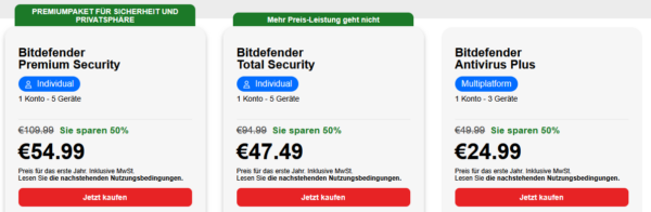 Das Angebot kann sich wirklich sehen lassen. Die Normalpreise sind von Bitdefender aus bereits um 50% reduziert, zusätzlich gibt es von MonsterDealz noch einen 20€ BestChoice-/Amazon.de Gutschein geschenkt. So kommt ihr auf folgende Kosten: