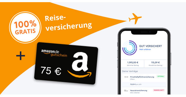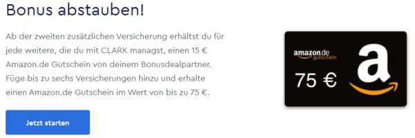 Denn ab sofort bekommt man über unseren Bonus-Deal bis zu 75€ Amazon.de -/BestChoice-Gutschein*, wenn man mindestens 2 Versicherungen hinterlegt und bekommt die CLARK Reiseversicherung obendrauf!