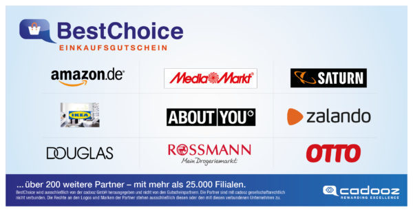 Mit dem BestChoice Premium-Gutschein habt ihr dabei volle Flexibilität, denn BestChoice Premium-Gutscheine sind in über 200 Online- und Offline-Shops einlösbar, u.a. auch bei Amazon.de*, Media Markt, Saturn, H&M, Galeria Kaufhof, Rossmann, Zalando, OTTO, Conrad, CinemaxX und vielen weiteren (PDF, Stand: April 2019).
