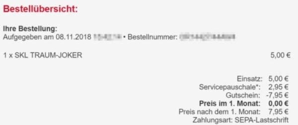 Der erste Monat ist komplett kostenlos, wenn ihr nur ein Los kauft. Zwar zahlt ihr pro SKL Weihnachts-Joker-Los 5€ (zzgl. 2,95€ Service-Pauschale, die aber nur einmal anfällt, egal für wie viele Lose ihr euch entscheidet). Ihr bekommt aber in diesem Deal einmalig einen Bonus von 7,95€, der mit dem Loseinsatz für den 1. Spielmonat verrechnet wird.