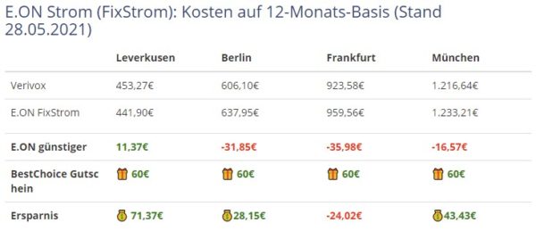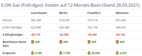Stuppsi 13.06.2020, 10:22 #Guter Deal. Habe auch gerade mal Vergleichstarife durchgespielt und da war der E.ON-Tarif nur knapp 20 Euro für das Jahr teurer als der günstigste Tarif den mir Check24 anbot – und der 60€-Gutschein gleicht die 20 Euro mehr ja wieder aus. Hab es darum abgeschlossen (Vertragsbeginn ist zwar "erst" zum Oktober – aber sooo lange ist das ja auch nicht mehr hin ;-)).
