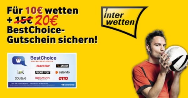 Für alle Neukunden von Interwetten haben wir nun wieder einen absolut geilen Bonus Deal am Start. Für die Einzahlung und den Einsatz von mindestens 10€ auf ein beliebiges Spiel (oder Casino) erhaltet ihr jetzt einen 15€ 20€ BestChoice-Gutschein von MonsterDealz on top! Man muss also kein Mathe-Ass sein um zu merken: Ein Gewinn von min. 10€ sind hier garantiert!