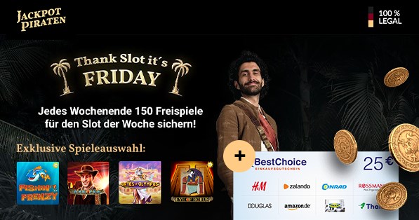 - Kombinierbar mit Jackpot-Piraten-Bonus-Aktionen wie z.B. 10 Freispiele für 10€ Einzahlung