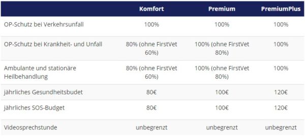 Dazu gibt es ein jährliches Gesundheits- und SOS-Budget für Vorsorgemaßnahmen oder Notfall-Leistungen, das je nach Tarif zwischen 80€ und 120€ liegt.