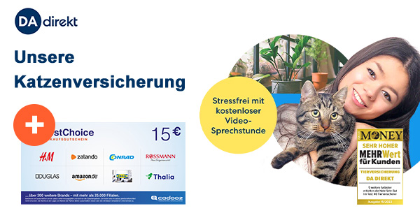 Ein Tierarztbesuch ist teuer – das wissen Hundehalter, ebenso wie Meerschweinchen-Besitzer und auch ich als Hühner-Mama weiß das. Wenn ihr euch eure heimischen vier Wände mit einer Katze teilt, dann hab ich hier was für euch: Die DA Direkt bietet eine Katzenversicherung an, bei der es schon ab 17,90€ im Monat los geht. Von MonsterDealz gibt es hier einen 15€ BestChoice-Gutschein dazu.