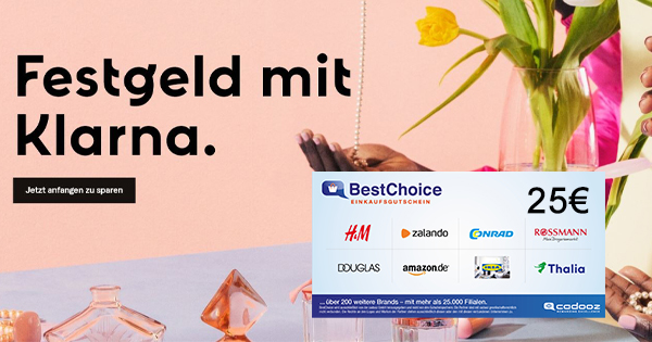 Klarna dürfte einige von euch durchaus ein Begriff sein. Klarna bietet neben verschiedenen Bezahlmethoden auch ein Festgeldkonto an. Wenn ihr dieses Festgeldkonto nun eröffnet und min. 5.000€ für sehr gute 1,15% Zinsen auf 12 Monate anlegt, erhaltet ihr von uns einen 25€ BestChoice-Gutschein on top! 🙂