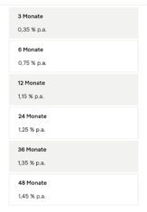 - Es muss innerhalb von 4 Wochen nach Eröffnung die Mindestsumme von 5.000€ auf (genau) 12 Monate angelegt werden