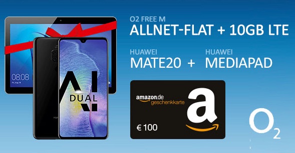 - O2 Free M für 39,99€/Monat + Huawei Mate20 + Mediapad T3 für 1€