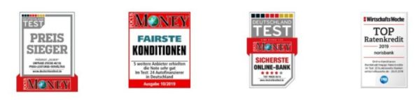 Die norisbank hat mehrere Auszeichnungen erhalten unter anderem von der Wirschaftswoche für den besten Ratenkredit (Vergleich bei 22 Banken) Die norisbank hat die Auszeichnung bereits zum 5. mal in Folge erhalten. Ebenfalls bei den Autokrediten überzeugt der Top-Kredit der norisbank und wurde von Focus Money in Zusammenarbeit mit dem Deutschen Finanz-Service als „Bester Autokredit“ ausgezeichnet.